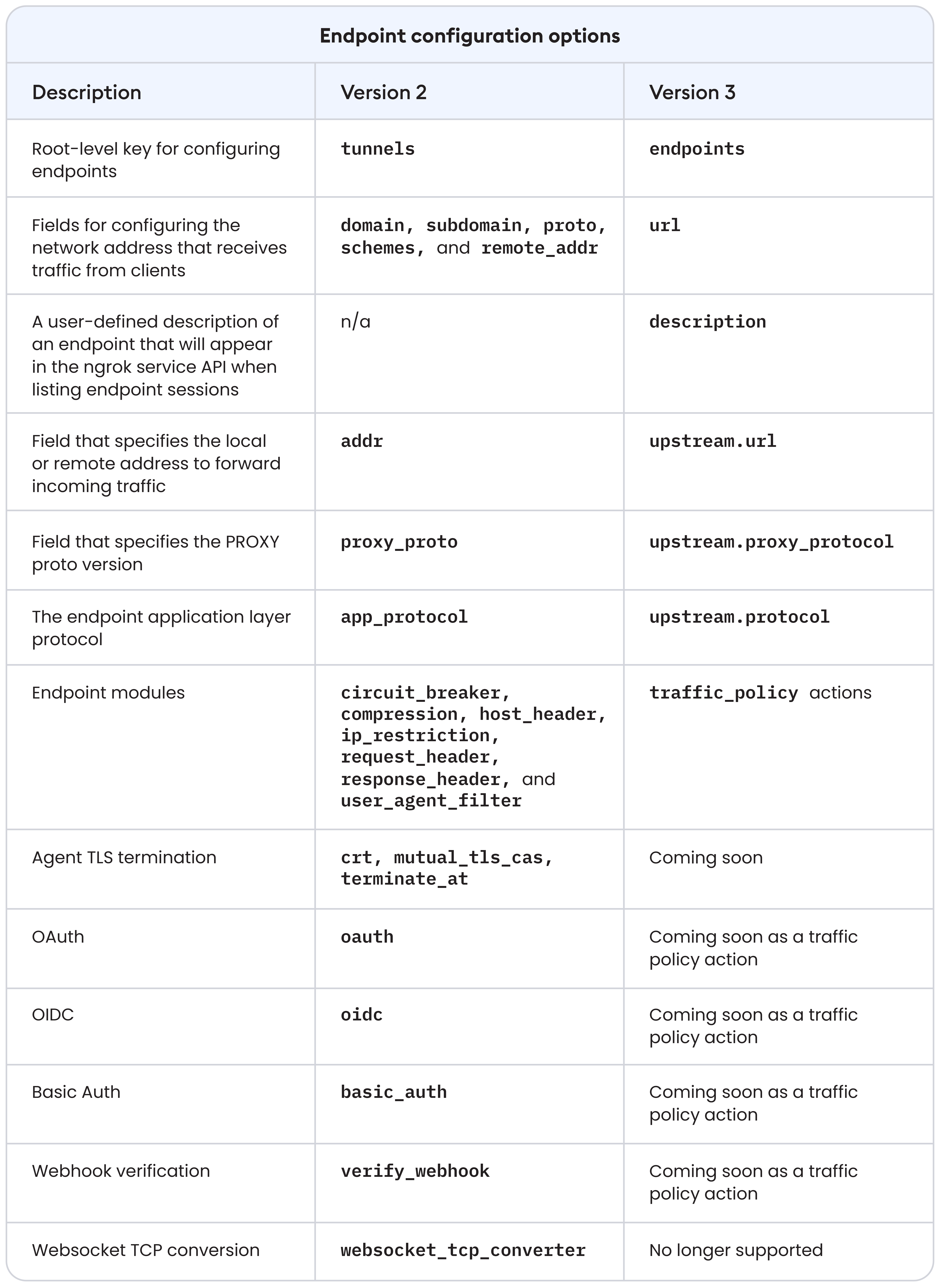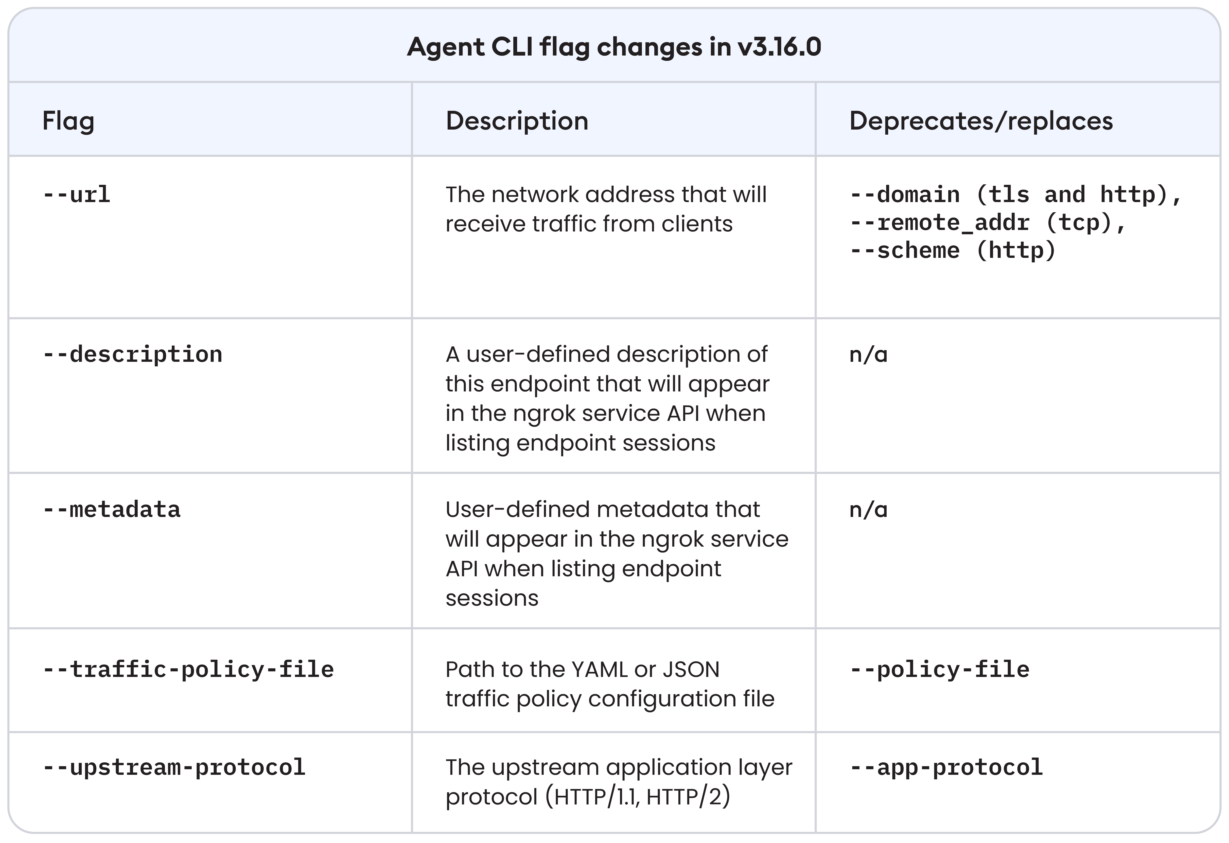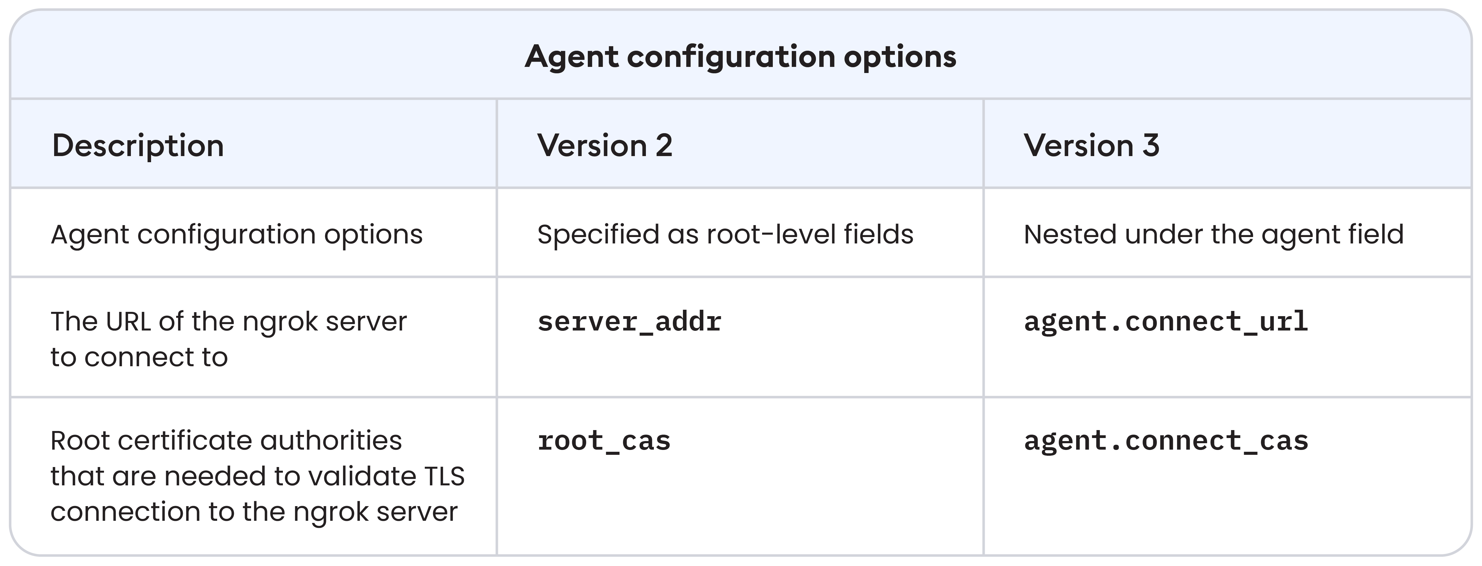 This shift brings changes in the ngrok agent—a new version of the agent configuration file and new flags in the agent CLI. We’ve also unified terminology and configuration across the CLI and agent configuration file to enhance clarity and consistency.