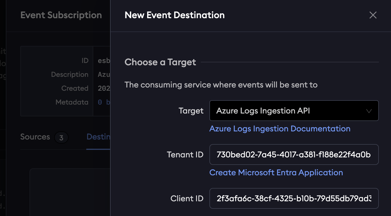 To configure this new Azure Monitor destination in ngrok, you will first need to set up and configure a new Azure Logs Workspace and Entra Application, as well as a new Data Collection Rule inside of your Azure account. Once you’ve completed those steps, configuring it in the ngrok Dashboard is as simple as creating a new event subscription, adding a few sources, and adding the Azure Log Ingestion API destination.