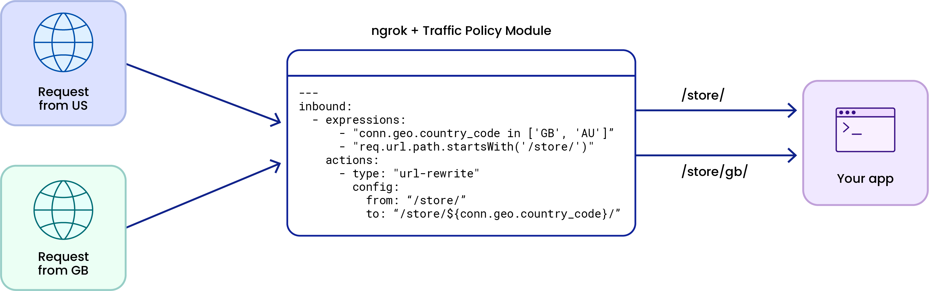 Connections that match said list, and are also pointed to the /store/ path, get redirected to a new path with the interpolated country code, letting you handle all the business logic around supporting different countries, languages, and currencies in your upstream service.