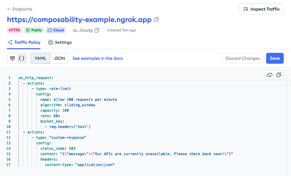 When you access the domain associated with your cloud endpoint (feel free to try https://composability-example.ngrok.app and hit the rate limit if you dare!), you'll see the custom response error code.