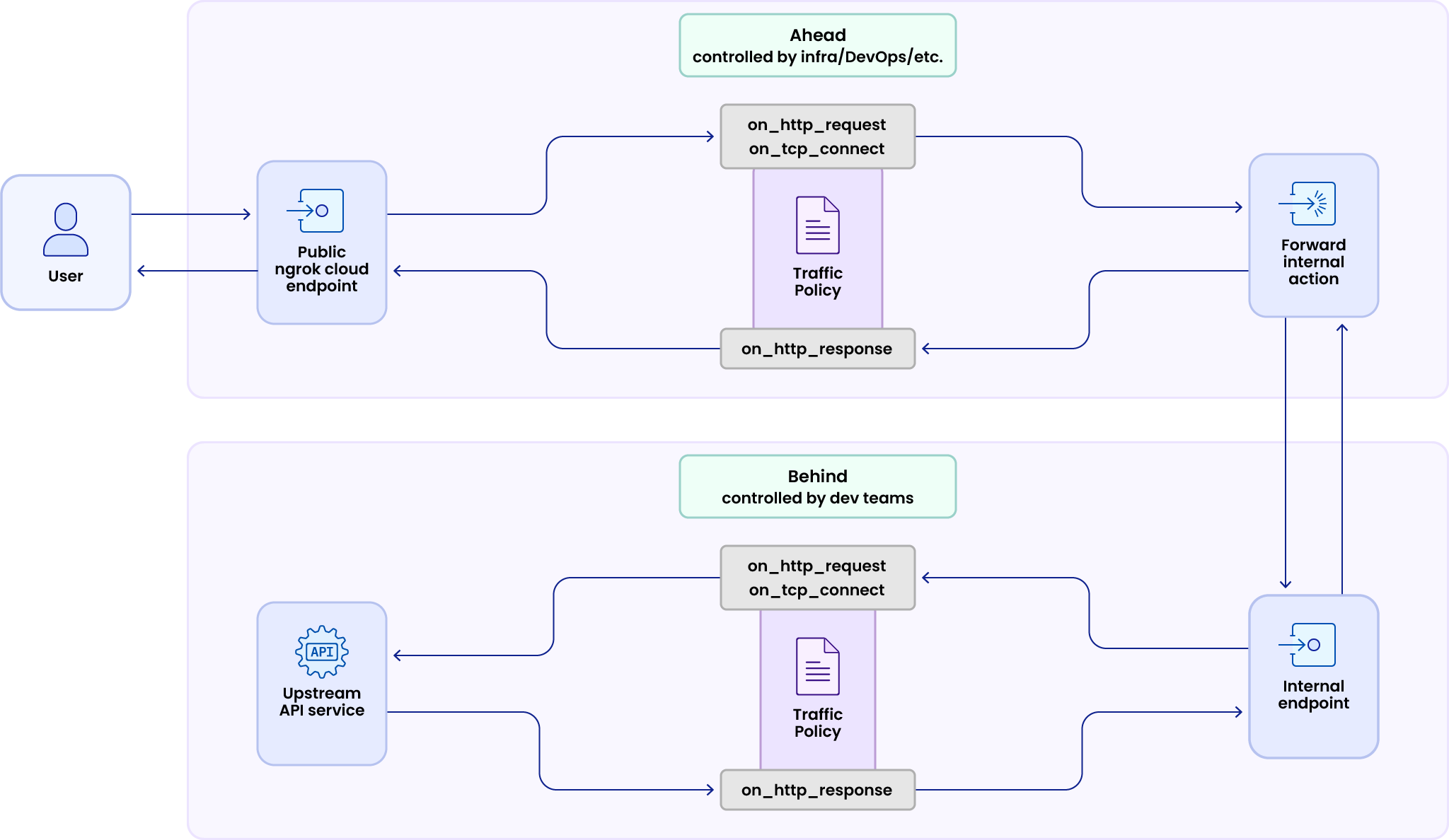 When you configure ngrok as an API gateway, there are multiple key moments in the lifecycle of a request where one can manipulate traffic using Traffic Policy. Every time a request enters an endpoint (public or internal), there’s a new opportunity to run Traffic Policy rules based on the quality of said request.