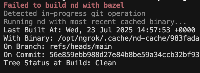 $NGROK_DATA/nd-cache/latestWhen nd fails to build, we can either automatically run the last known good build, or suggest the developer re-run the command and helpfully print the exact invocation of nd they need to run the same command using this cached build.