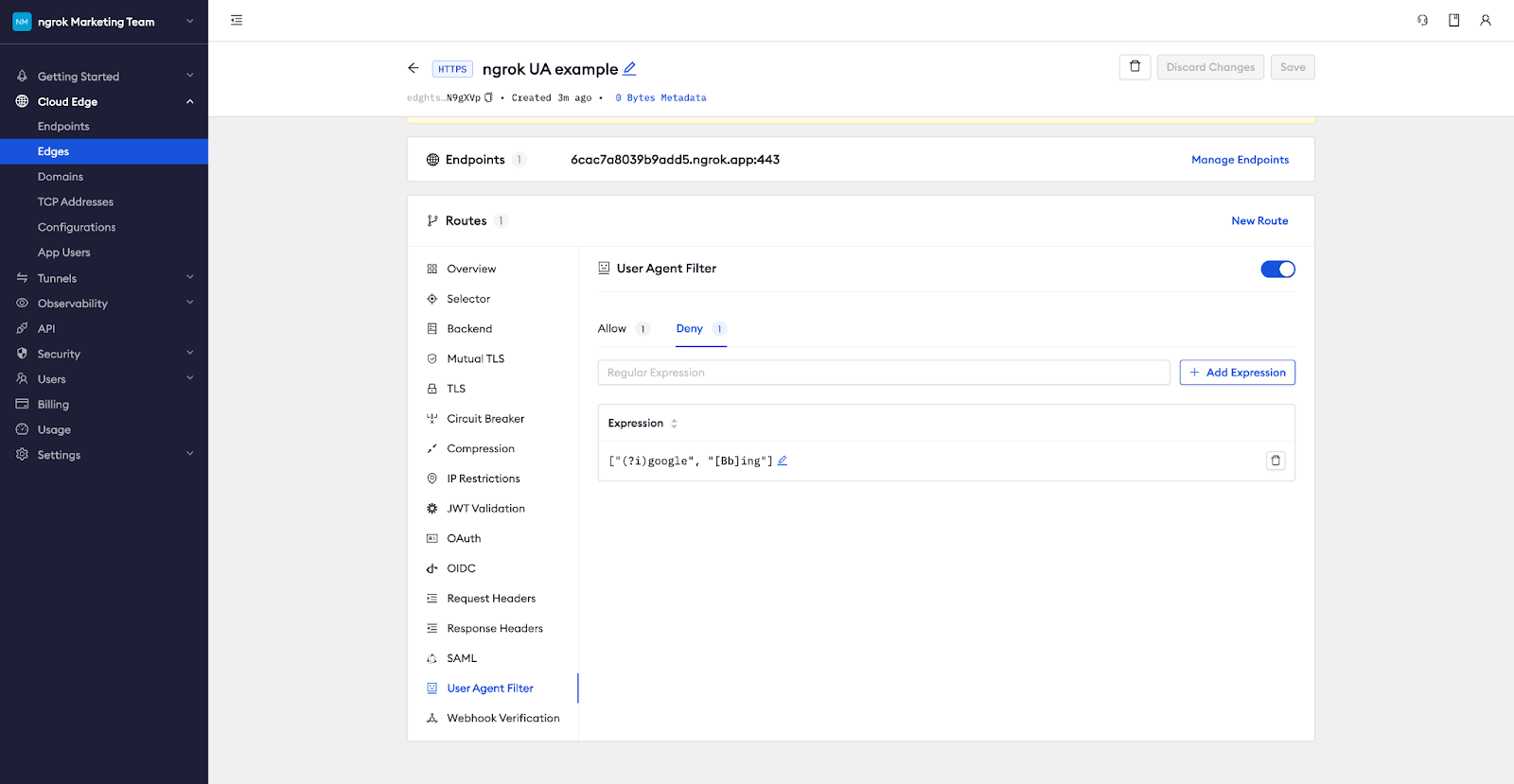 ngrok http 80 --ua-allow (?i)google-images --ua-deny (?i)google --ua-deny [Bb]ingYou can also modify the allow and deny list for any of your endpoints directly in the UI:
