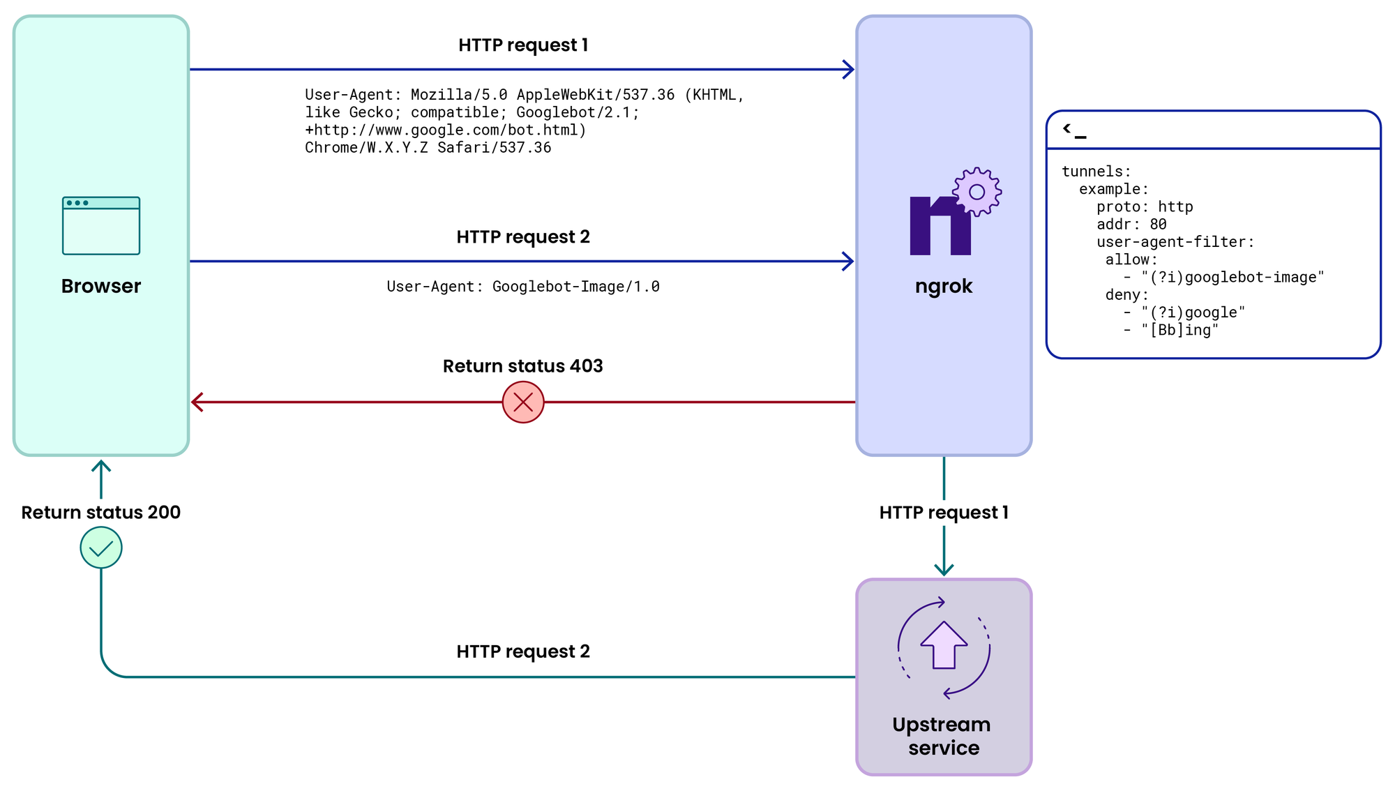 When a request destined for your upstream service arrives in ngrok’s global network, the User Agent Filter module checks the user-agent header against the list of defined allow and deny regular expression rules.