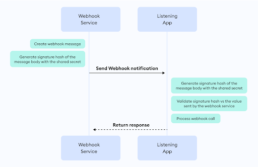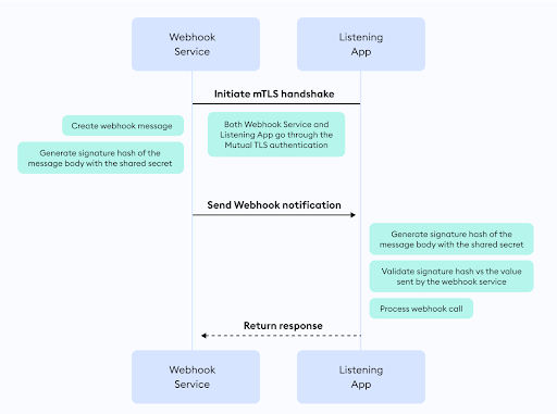 The use of mTLS authentication ensures that traffic is secure and trusted in both directions between webhook services and listener apps. With mTLS, both webhook service and listener apps pass through a TLS handshake — in which each system is required to authenticate with their certificates — before the webhook message is sent. This method delivers a stronger authentication between the webhook service and listener, ensures communication confidentiality (the webhook message is sent only after both sides are authenticated), and both integrity and non-repudiation (when combined with webhook signatures).