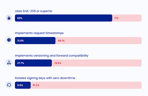 Of the webhook providers using HMAC, 83% sign their webhook messages with SHA-256, which is considered a strong hashing algorithm for webhook authentication and message integrity. Unfortunately, the vast majority won't include features to mitigate other attacks: