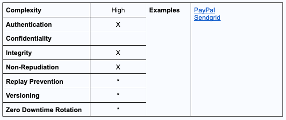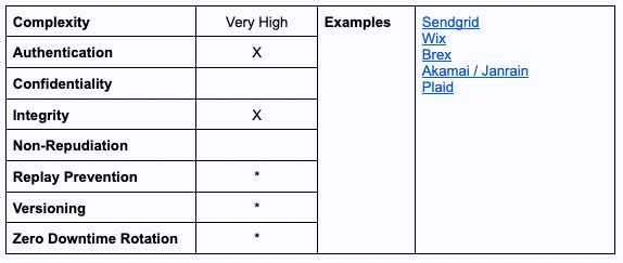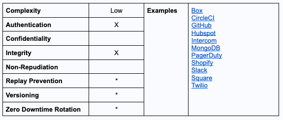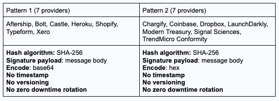 As a result, of the webhook providers we integrated with at least one additional security control — timestamp, versioning, or zero downtime rotation — only 2 services used the same procedure for validating their signatures: Calendly and Mux.