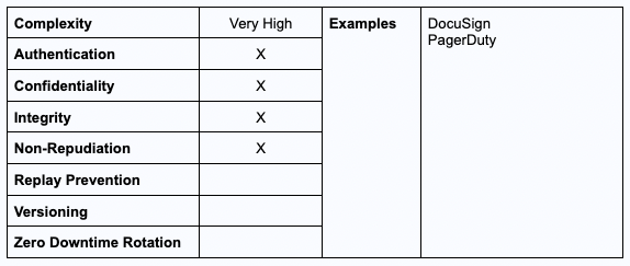 Asymmetric Key Encryption (RSA and ECDSA) — despite its non-repudiation controls — is not widely adopted. We believe this is likely due to the complexity of rotating keys.