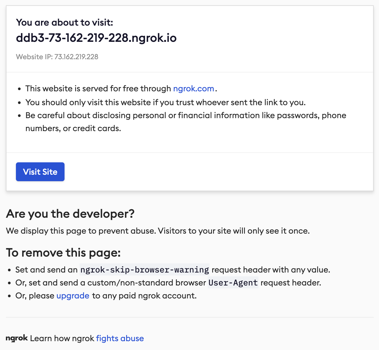 When someone registers for a free ngrok account and installs their token to authenticate to the service, they are now allowed to serve HTML traffic, but each time a user visits that URL, they are presented with a warning screen letting them know that the site is being hosted by ngrok and that they should not enter any sensitive information. This page also includes the IP address of the user hosting the content.