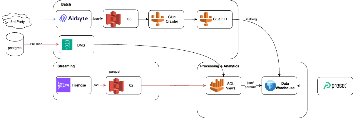 We used AWS DMS here to get our core Postgres data, writing parquet data to S3.