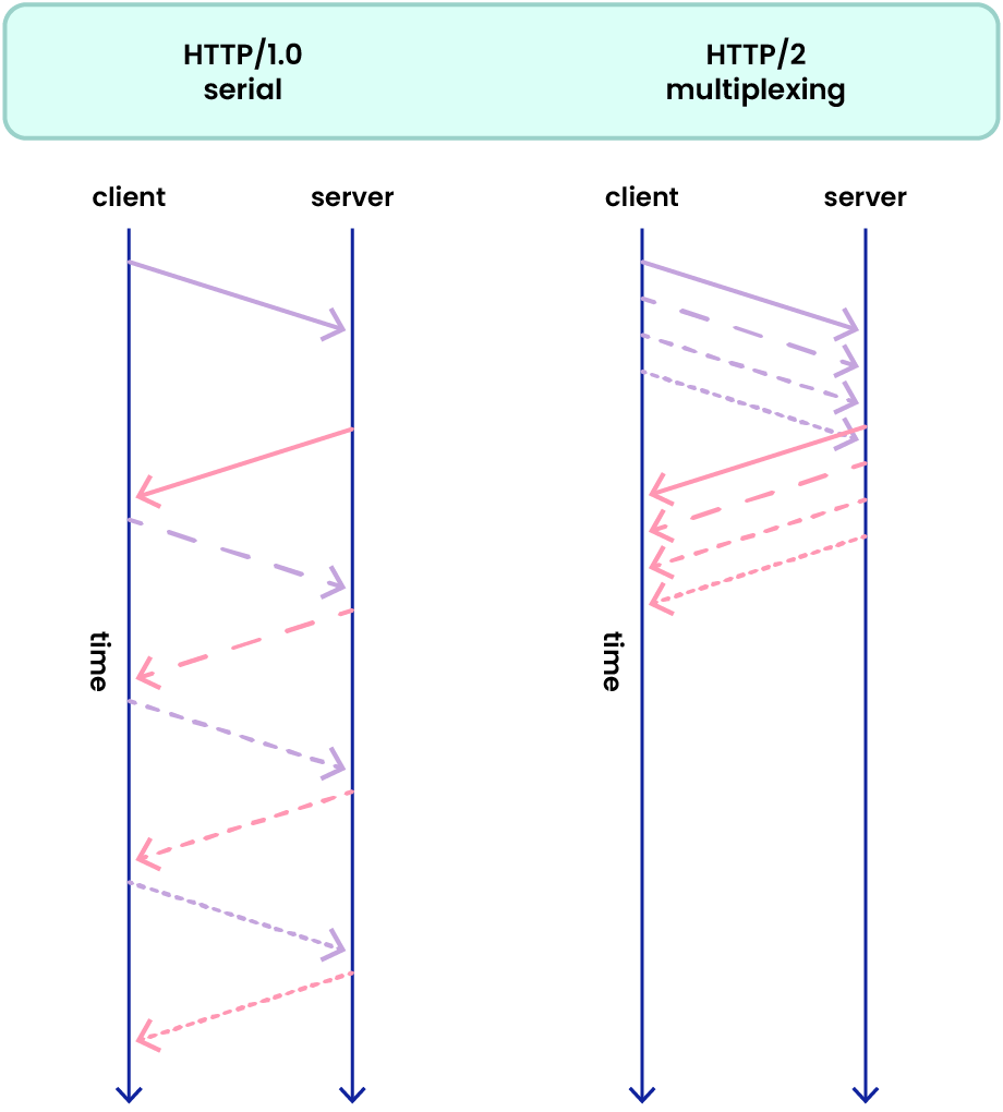 Each of those improvements combines to create a much more efficient process of passing data. The binary encoding and header compression work together to create smaller messages transmitted over the wire. The multiplexing and stream prioritization allow for multiple channels that can run in parallel and be prioritized by opening a single TCP connection and transmitting assets instead of continually opening and closing a TCP connection for each asset.
