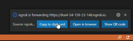 The extension installs the ngrok agent and sets up VSCode behind the scenes without even asking you to restart the IDE (this is high quality! Did I say thank you again, Phil?)