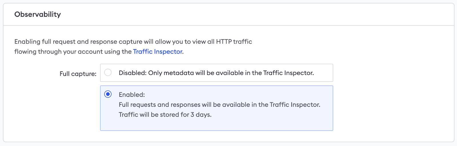 The new Traffic Inspector is available to all accounts during the developer preview with a 3-day retention period. By default, only metadata is captured about your traffic, but Admins of the account can opt-in to full traffic event capture which will capture complete request and response traffic to your endpoints.