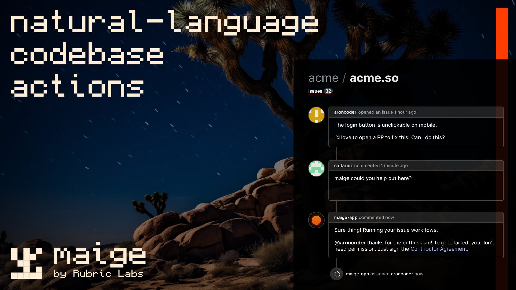 Maige is available in alpha with the Rubric Labs team working fast and furiously to get it in the hands of users. Add it to your repo today and get started.