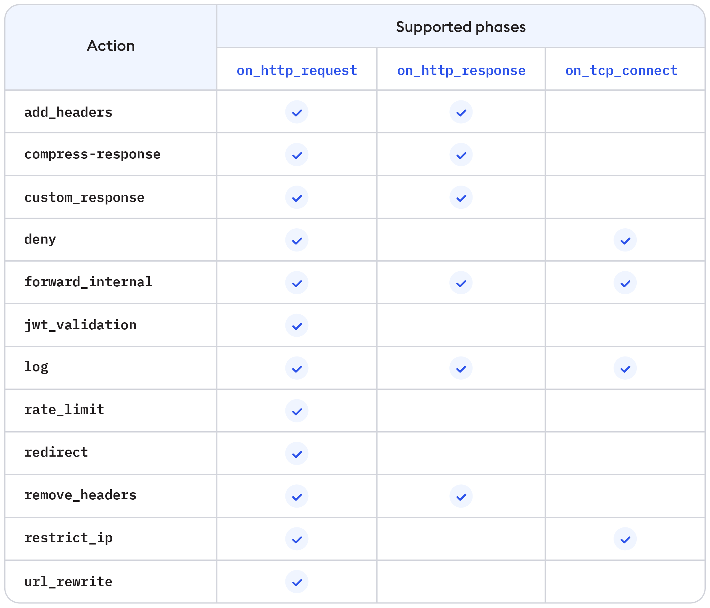 on_tcp_connect replaces inboundHere’s a table that details which actions are supported at each phase: