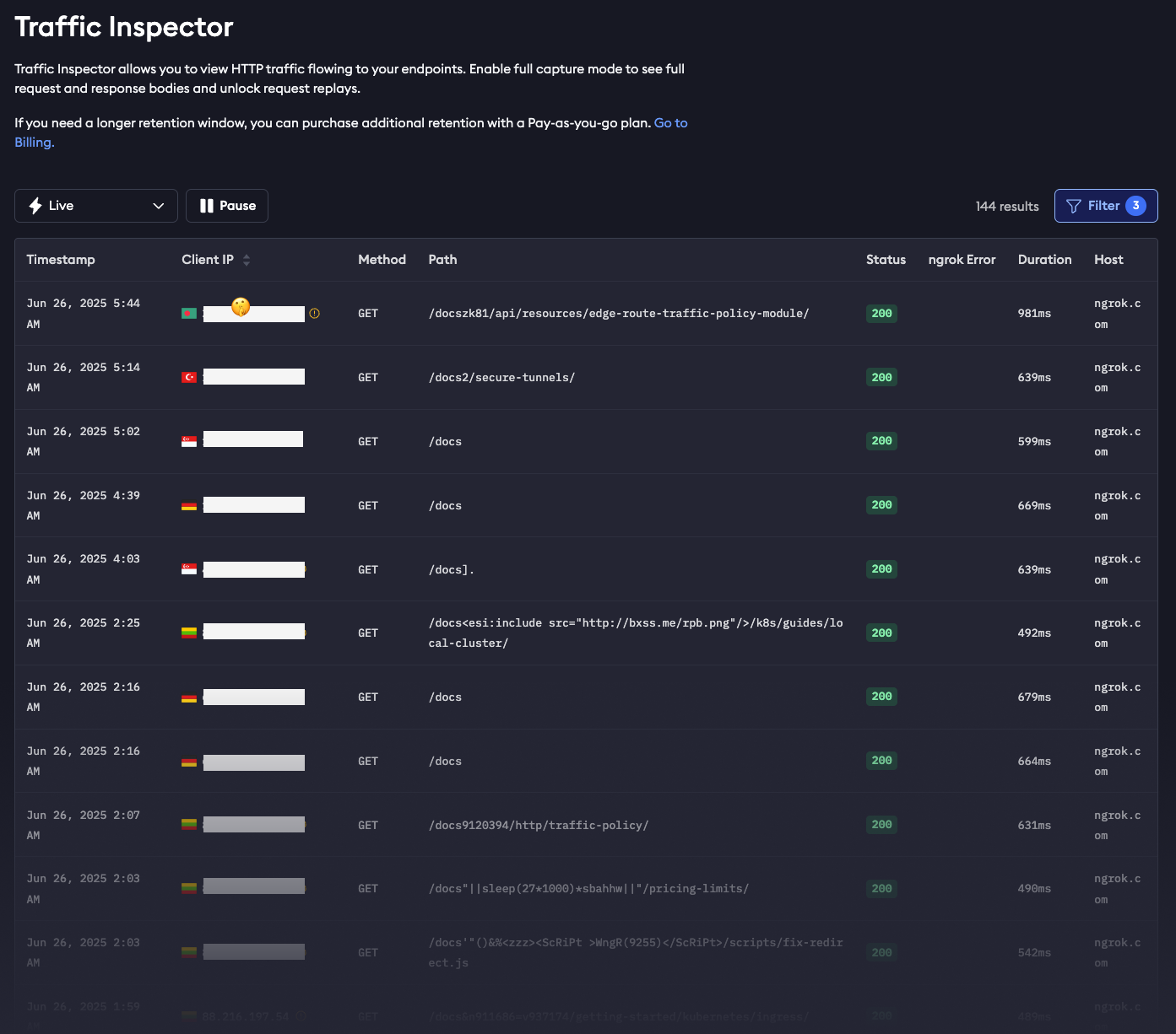 As a bonus, ngrok also offers Traffic Inspector: a real-time stream of traffic events that you can filter by path, status code, method, or endpoint. It’s not a full replacement for a log aggregation system, but it’s a surprisingly handy tool for debugging issues or validating config changes.
