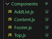 The components folder houses the AddList.js, Content.js, Footer.js, and Top.js components. App.css is the CSS file for the application; index.js will render the App.js file. The data folder is the parent to the database file, and App.js will render all the application components.