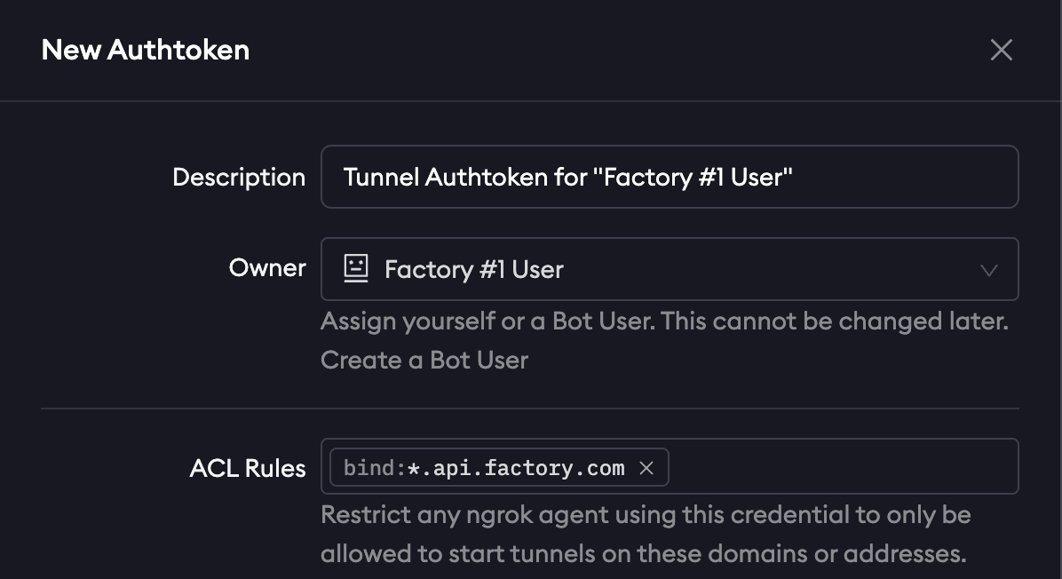 https://api.ngrok.com/bot_usersNavigate to the Authtokens section of your ngrok dashboard and create an authtoken for that bot user and assign it an ACL binding, so that it can only create endpoints bound to the reserved wildcard domain for that factory’s telemetry API.