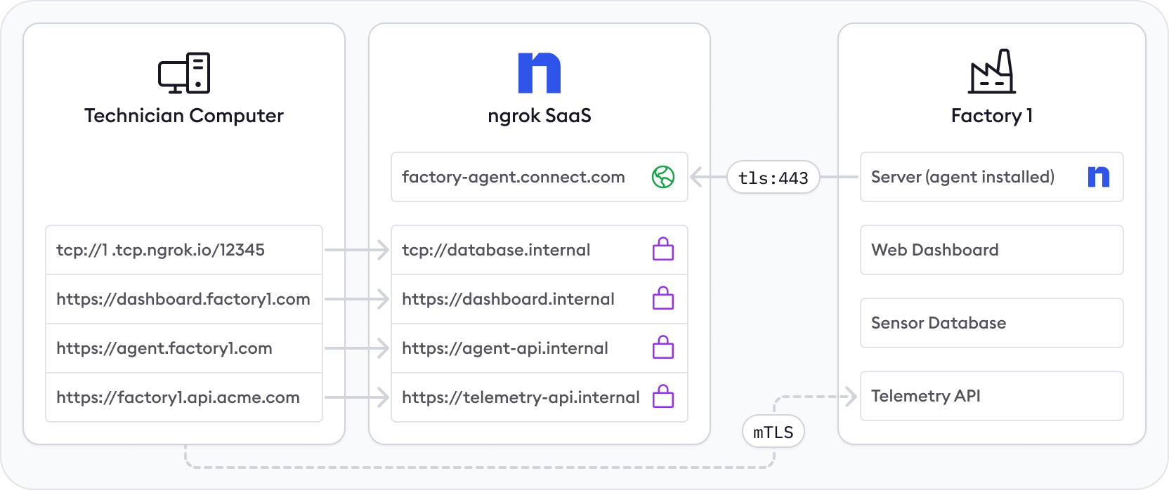ngrok is a universal gateway, which means it allows you to create secure ingress to any app, IoT device, or service without spending hours learning arcane networking technologies. When you deploy a single ngrok agent per factory, you can control access to all your systems without exposing any machines to the public internet. That's a big win for security and reliability.