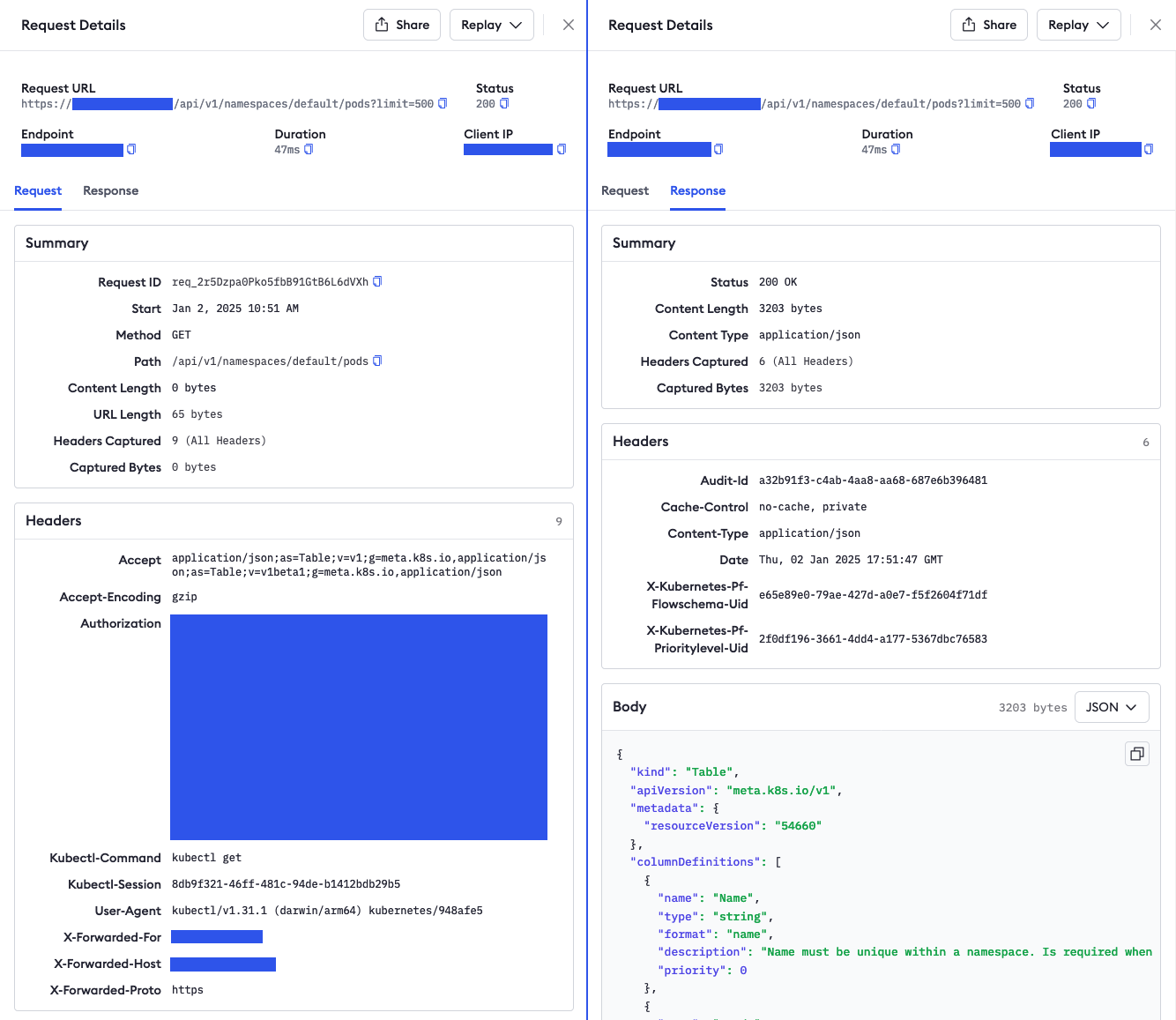 I’ve anonymized some of the details, but the request headers and response body contain valuable details about who is accessing your K8s APIs, using which user roles or service accounts and associated tokens, what actions they’re trying to perform, and how your cluster responds.