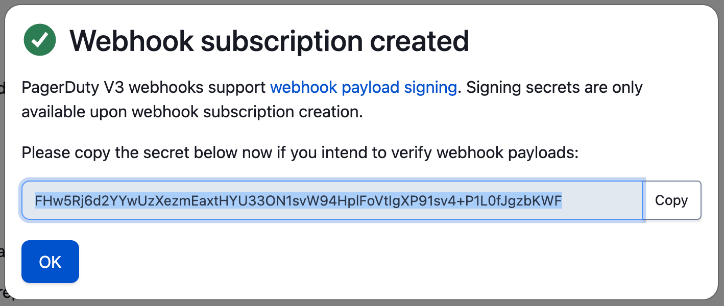Next, you’ll use --verify-webhook-secret={your_webhook_payload_signing} replacing {your webhook payload signing} with the secret value you are given in PagerDuty when creating the webhook.